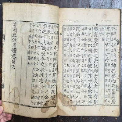 중국 한나라 정현(鄭玄)의 주석이 붙은 『주례』를 도설과 함께 엮어 간행된 예서이다. 권두에 도설(周禮經圖)을 수록하여 이해를 돕고, 본문에는 정현의 주석을 첨가하여 조선 후기 유학자들이 예학(禮學)을 연구하는 데 중요한 교재가 되었다. 훈련도감자(訓鍊都監字)는 임진왜란 이후 국가적 위기 속에서 등장한 활자로 훈련도감에서 책을 찍는 데 사용된 활자이다. 얼룩有 그 외는 상태 양호.