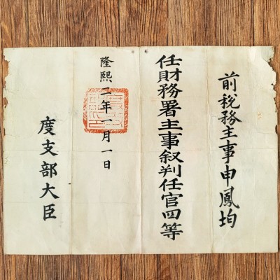 탁지부 대신이 세무 주사(稅務 主事)였던 신봉균(申鳳均)을 재무서 주사로 임명한다는 임명장으로 탁지부 직인이 찍혀 있다. 재무서는 1908년 지방 각 군의 세무와 재무를 담당하기 위해 지방행정 기구와 별도로 탁지부(度支部) 산하에 설치된 기구였으나 1910년 8월 조선이 일본의 식민지가 되자 폐지되고, 그 업무는 지방 각 부·군 등 지방행정 기구로 넘어가게 되었다. 상태 양호.