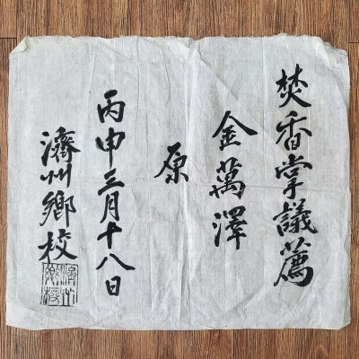 2. 丙申年(1896년 혹은 1956년) 제주향교 분향장의(焚香掌議, 향교에서 제사나 의식을 행할 향을 사르는 의식 등을 주관하는 직책)에 김만택(金萬澤)을 임명한다는 임명장이다. 제주향교라는 도장이 찍혀 있다.상태 양호