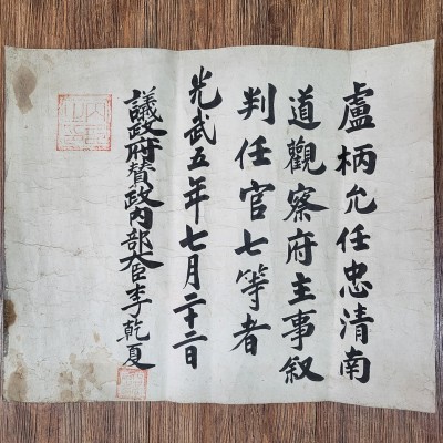 노병윤(盧柄允)을 충청남도 관찰부 주사(觀察府 主事)로 임명한다는 임명장이다. 내부 직인과 내부대신 직인이 찍혀 있다. 상태 양호.