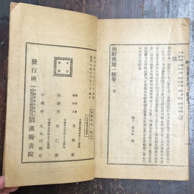 조선의 주요 지역, 산천, 고을, 인물, 풍속 등을 총망라한 지리서로 기존의 『동국전도』, 『동국지도』 등 전통 지리 자료를 참고하여 편찬되었다. 최영년(崔永年, 1859–1935) 발문. 저자인 강덕오(강효석)은 한양서원을 직접 경영하였으며 저서로 『전고대방(典故大方)』(1924), 『대동기문(大東奇聞)』(1926), 『동국전란사(東國戰亂史)』(1928), 『조선여지일통』(1931) 등. 상태 양호.